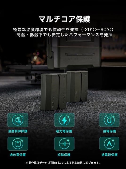作動温度 -20°C~60°Cで極端な温度環境でも信頼性を発揮。 高温・低温下でも安定したパフォーマンスを発揮。 バッテリーの充電は周囲温度が10℃~30℃の環境で行うことをおすすめします。