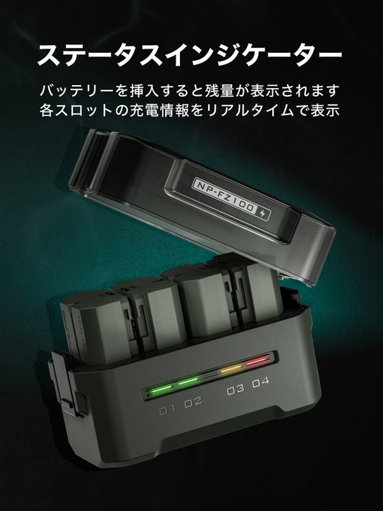 リアルタイム充電ステータスインジケーターを搭載しており、各スロットの充電状況を即座に確認可能。USB-C急速充電(PD 45W対応)により、標準的な充電器と比較して充電速度が約68%向上。約3時間で4つのNP-FZ100バッテリーをフル充電できるため、長時間の撮影でも安心して使用できます。