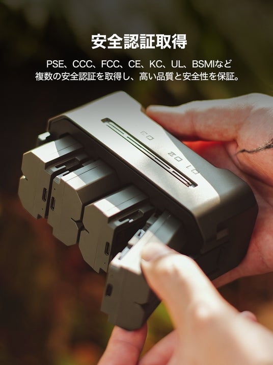 純正バッテリーと同じ寸法で設計されており、カメラに完璧にフィット。 さらに、PSE、CCC、FCC、CE、KC、UL、BSMIなどの国際安全認証を取得し、安心して使用できます。