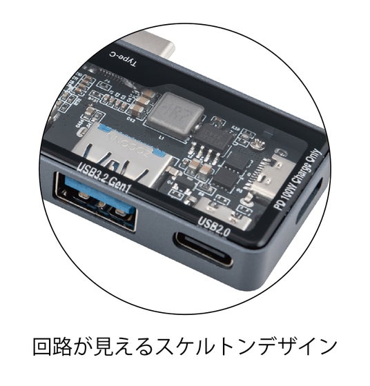 PD対応 USB3.2Gen1 Type-C スケルトン 2ポートコンボハブ (3.5mm 4極付き)