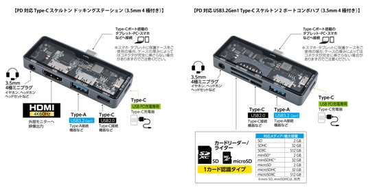 両製品の異なる点は、「PD対応 Type-C スケルトン ドッキングステーション (3.5mm 4極付き)」は4K60Hz対応のHDMI、「PD対応 USB3.2Gen1 Type-C スケルトン 2ポートコンボハブ (3.5mm 4極付き)」はSD・microSD対応のカードリーダー/ライターを搭載しており、用途に合わせてお選びいただけます。