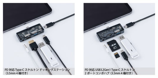 「PD対応 Type-C スケルトン ドッキングステーション (3.5mm 4極付き)」、「PD対応 USB3.2Gen1 Type-C スケルトン 2ポートコンボハブ (3.5mm 4極付き)」発売