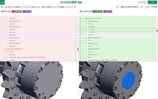 3D Docs 2.0で設計前後の部品表とモデルを並べて比較、重要な変更のハイライトも可能に