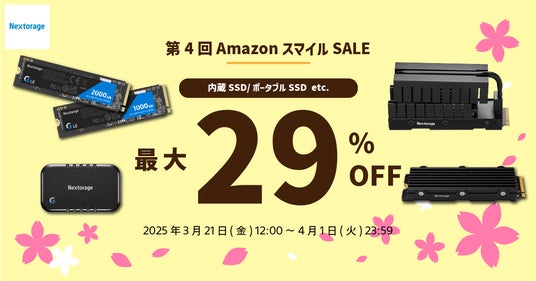 Nextorage株式会社(ネクストレージ株式会社、代表取締役:本多 克行、神奈川県川崎市)は、2025年3月21日(金) より開催されるハードライン事前セール、続けて2025年3月28日(金)より開催される第4回Amazon スマイルSALEに、SSDなどのゲーミング製品で参加することをお知らせいたします。