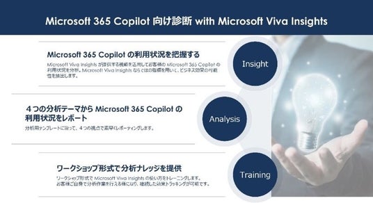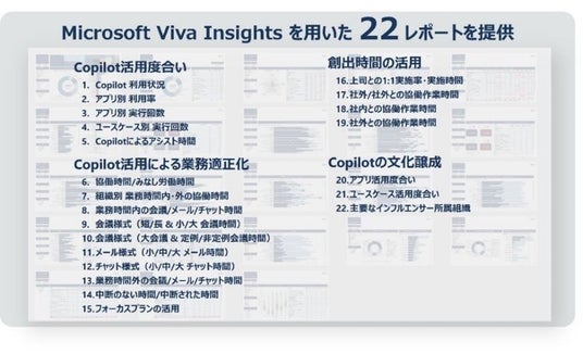 ※2 Microsoft Viva Insights:「Microsoft 365」の機能の1つで、従業員の生産性やウェルビーイングを向上させるための分析情報を提供するツール。「Microsoft 365」に蓄積されたデータから従業員のコミュニケーションに関する行動や傾向など「Copilot」の使用状況を分析することができる。