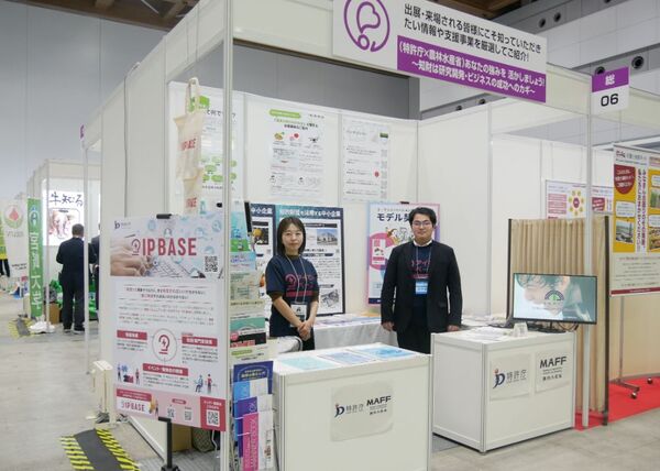 アグリビジネス創出フェアは、全国の大学や研究機関、企業が有する農林水産・食品分野などの研究成果を紹介し、研究機関同士の連携を促す技術交流展示会だ。特許庁は農林水産省と共同でブースを出展し、研究開発や社会実装へ知財を活用した事例や特許庁の支援施策を紹介した。
