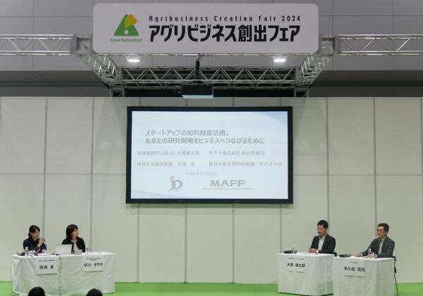 スタートアップ向けの知財戦略ポータルサイト「IP BASE」を展開する特許庁スタートアップ支援班は、2024年11月26日から28日の3日間、東京ビッグサイトで開催された農林水産省主催の技術交流展示会「アグリビジネス創出フェア2024」に出展。最終日の28日には、農林水産省との共同による知財セミナー「スタートアップの知的財産活用。あなたの研究開発をビジネスにつなげるために」を実施。農林水産分野に詳しい知財専門家とアグリテック・スタートアップの知財担当者が登壇し、アグリビジネスの課題と必要な知財支援について意見を交わした。