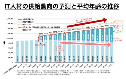 日本のIT分野では、人材不足が深刻化しています。経済産業省の調査によると、2030年にはIT人材の需要が約200万人に達する一方、供給は約120万人にとどまり、最大79万人の人材が不足すると予測されています。