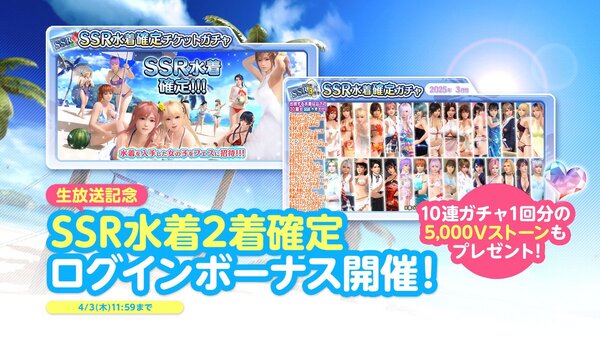 公式生放送報酬として、「SSR確定ガチャチケット(2025年3月号)」「SSR確定ガチャチケット」「無償Vストーン×5000個」を受け取れる期間限定ログインボーナスを開催。
