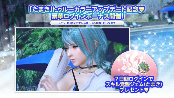 「トゥルーカラーコーデガチャ」では、「たまき」専用水着の提供割合がアップしている。また、有償Vストーンによる10連ガチャのおまけとして「たまきパレット」10個を入手可能。開催期間は、2025年4月3日11時59分まで。