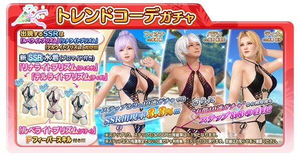登場するSSR水着は以下の「ルベライトプリズム」「リナライトプリズム」「テルライトプリズム」のみに。10連ガチャのステップ3/3では、SSRの出現確率が3.3%になる。開催期間は、2025年3月26日11時59分まで。