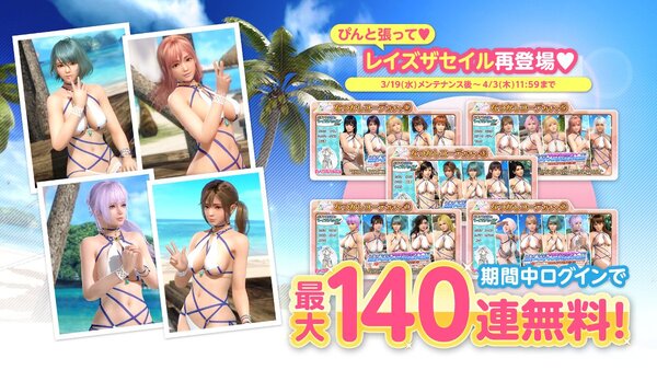 過去に登場したSSR水着「レイズザセイル」が5種類のガチャで登場。登場するSSR水着は「レイズザセイル」のみとなり、10連ガチャのステップ6/6では、有償Vストーン限定の10連ガチャ利用時のみ、「レイズザセイル」1着を確定で入手できる。開催期間は、2025年4月3日11時59分まで。