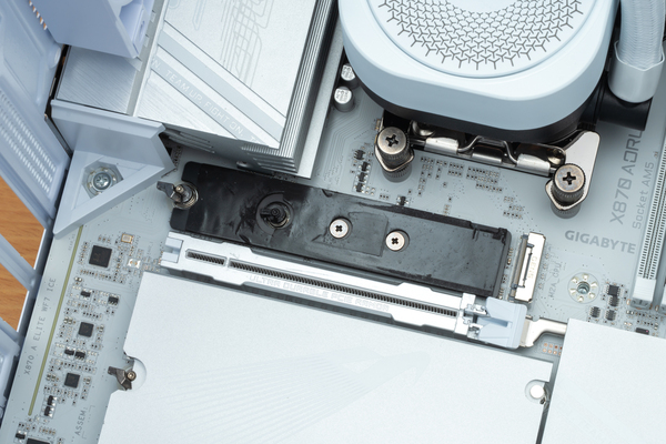マザーボードには、大型ヒートシンクと基板裏面から冷却するM.2 Thermal Guardバックプレートを装着しているGIGABYTE「X870 AORUS ELITE WIFI7 ICE」を使っている。