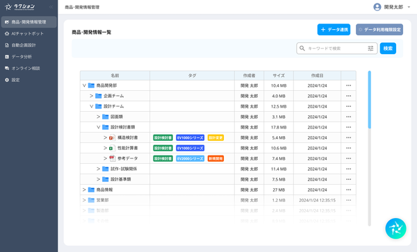 「ラクション」は、社内の情報と連携して、「データを活かした商品開発/DX」を実現するAIシステムとのこと。独自のAI・データ活用技術を用いて、情報収集、仕様検討、書類作成といったメーカーにおける企画・設計開発業務をサポートし、商品開発における工数・コスト削減と新価値創出を支援する。