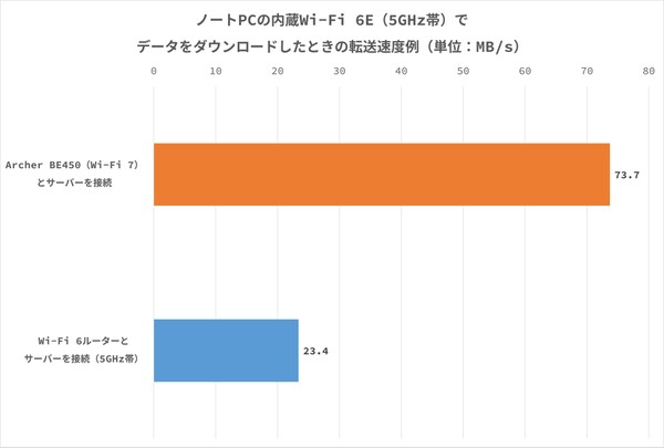 「Archer BE450」とサーバーをWi-Fi 7でつなぎ、ノートPCの内蔵Wi-Fi 6E(5GHz帯)でデータをダウンロードしたときは毎秒70MB程度。Wi-Fi 6ルーターを使った場合は毎秒23MB程度と大きく差が出た