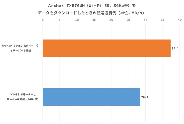 「Archer BE450」とサーバーをWi-Fi 7でつなぎ、Archer TXE70UH(Wi-Fi 6E、5GHz帯)でデータをダウンロードしたときは毎秒37MB程度。Wi-Fi 6ルーターを使った場合は毎秒28MB程度となった