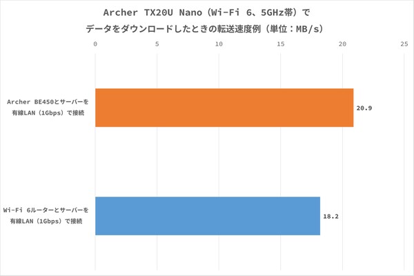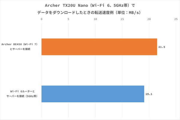 「Archer BE450」とサーバーをWi-Fi 7でつなぎ、Archer TX20U Nano(Wi-Fi 6、5GHz帯)でデータをダウンロードしたときは毎秒22MB程度。Wi-Fi 6ルーターを使った場合は毎秒19MB程度となった