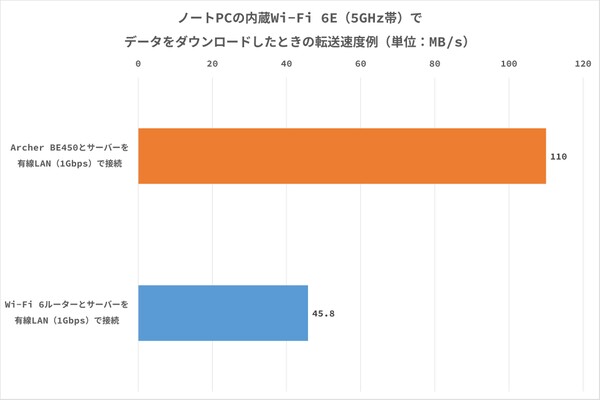 「Archer BE450」とサーバーを有線LAN(1ギガビット)でつなぎ、ノートPCの内蔵Wi-Fi 6E(5GHz帯)でデータをダウンロードしたときは毎秒110MB程度。Wi-Fi 6ルーターを使った場合は毎秒45MB程度と大きく差が出た
