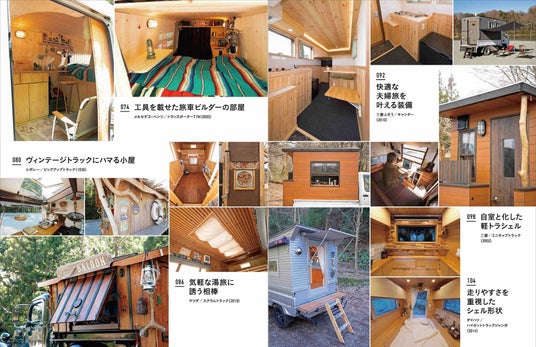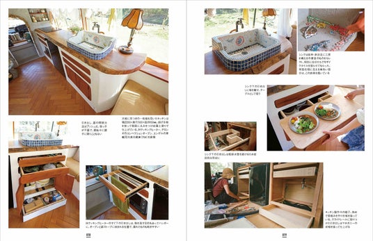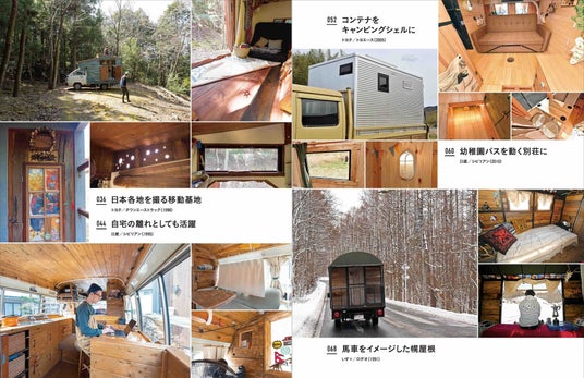 少しだけ例を挙げると、DIY未経験だった夫妻が作った、本格的なキッチンや薪ストーブを備えたマイクロバス。家族4人がゆったり寝られるように2種類の展開式ベッドを作りつけたセミウォークスルーバン。荷台に載せたコンテナの内部を木装し、キッチンとダイネット(リビングスペース)兼ベッドルームに区分けしたダブルキャブトラック。幌屋根と廃材でリメイクしたキャンピングカー。伸縮式の自作シェルを載せた軽トラ……それぞれベース車も、搭載する装備も、こだわりのポイントも違っていて、ページをめくるたびに新たな発想に出会えます。