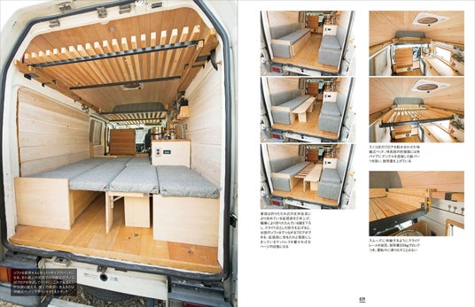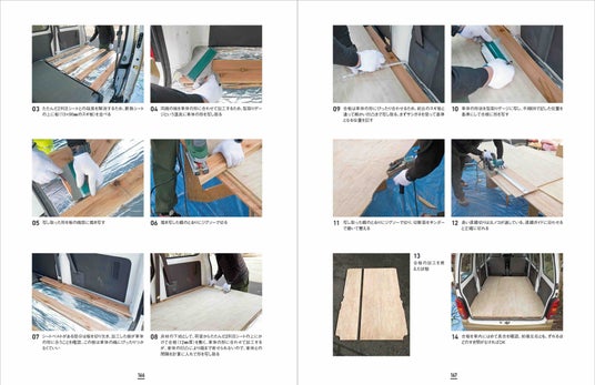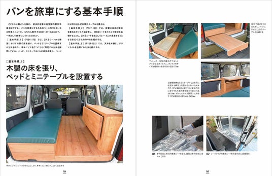 最後の30ページでは、軽バンを例に、床と天井の木装、ベッドとテーブルの設置、照明の設置といった旅車作りの基本的な作業手順を細かくリポートしています。