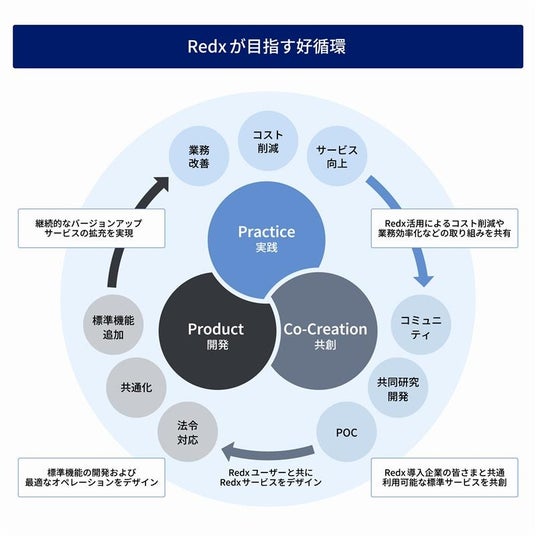 Redxが目指すのは、「開発⇒実践⇒共創⇒開発」という好循環です。標準機能の開発と実践を繰り返し、現場でのフィードバックをもとに業界全体で共創しながら進化することで、常に最適なシステムを提供。これにより、 小売業共通の業務は標準機能で効率化され、コスト削減を実現します。また、標準機能で共通業務を効率化することで、企業ごとに差別化を図るべき競争領域には、資源を集中投資できる環境を整えます。
