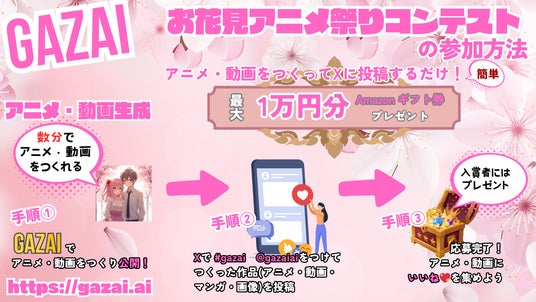 株式会社GAZAI(本社:東京都渋谷区、代表取締役:一岡亮大、以下「当社」)は、生成AIプラットフォーム「GAZAI」(https://gazai.ai/)にて、3/21(金)11:00から4/7(月)23:59迄、アニメ・動画・マンガ・画像を生成できるAI機能を活用して春のお花見アニメ祭りコンテストを実施致します。