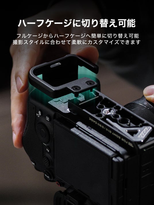 フルケージとハーフケージをワンタッチで切替可能なモジュール設計を採用。全ケージ状態では最大限の保護と拡張性を確保し、必要に応じてネジを外すだけで軽量なハーフケージとしても使用できます。