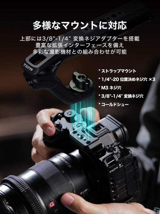 上部には1/4インチネジ穴を多数配置し、トップハンドルやモニター、マイク、LEDライトなど、さまざまなアクセサリーの取り付けに対応。映像制作の幅を広げます。