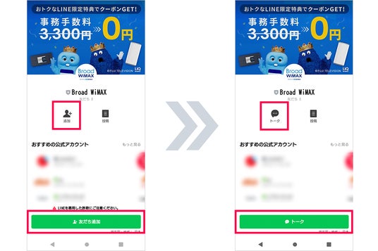 Broad WiMAXのLINE公式アカウントを登録すると、最新情報やお得なキャンペーンの情報をいち早く受け取ることができます。