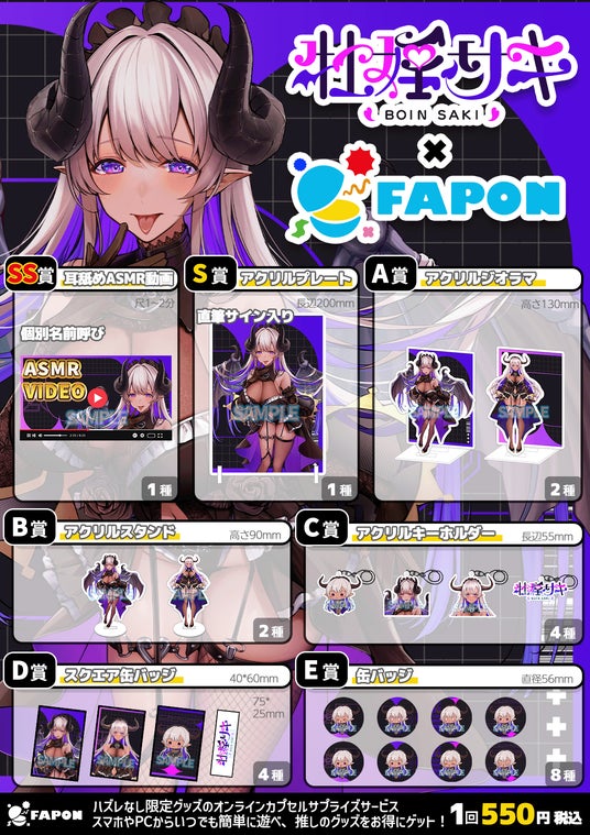 VTuber事務所として初となる自社オンラインくじ『FAPON』にて、072inc専属VTuber牡婬サキがタイアップを展開。