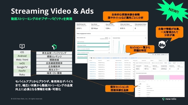 まずは、動画ストリーミングのオブザーバビリティを実現する「Streaming Video & Ads」だ。動画の品質向上に必要な情報を収集・可視化する機能で、モバイルアプリからブラウザ、専用の再生デバイスまで、幅広いチャネルの動画に対応する。