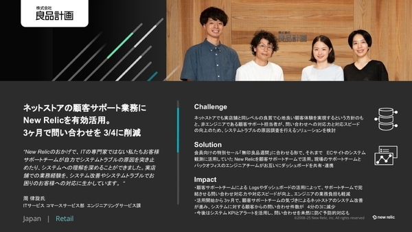 例えば良品計画では、ネットストアにおける顧客サポートチームが活用。New Relicでシステムトラブルの原因をつきとめて一次回答することで、問い合わせの対応速度を向上させた。エスカレーション先のエンジニアの負担も減り、システム改善に集中できるようになったことで、導入開始3カ月で問い合わせ件数は3分の1まで減ったという。