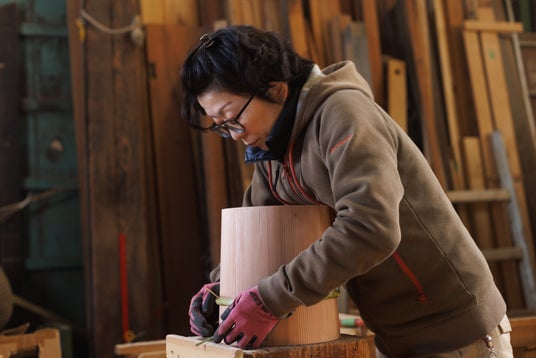 藤井製桶所を支える職人。一本一本竹箍(たけたが)を締め、木桶に命を吹き込む