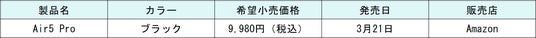 本製品の発売を記念し、下記日程でAir5 Proの特別セールを実施します。大変お求めやすい価格で提供いたしますので、ぜひご利用ください。