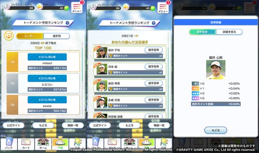実際のJLPGAツアーのトーナメントで活躍すると思われる選手を、コレクションしているデジタルカードから選択し、ゲーム内で予想するリアルと連動した機能です。予想ポイントにはトーナメントの最終順位だけでなく、「パーオン率」「フェアウェイキープ率」「ドライビングディスタンス」「バーディー」「パー」「ノーボギー」等のホールスコアデータのスタッツも反映されるので、ユーザーの分析力が試されます!ゲーム内で「トーナメント予想」をしながら実際のトーナメントも観戦することで「新しい女子プロゴルフの楽しみ方」が生まれること間違いなし!!
