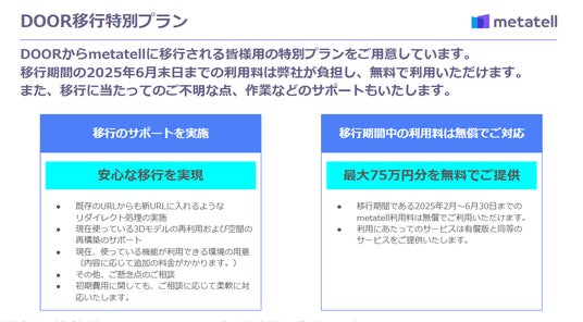 株式会社Urth(本社:東京都新宿区、代表取締役:田中大貴、以下“Urth”)と株式会社NTTコノキュー(本社:東京都千代田区、代表取締役:丸山 誠治、以下”コノキュー”)は、コノキューが提供するメタバースサービス「DOOR」の3月末のサポート終了にあたり、Urthが提供するmetatellへの移行を支援するために、移行ツールをリリースしたことをご案内いたします。