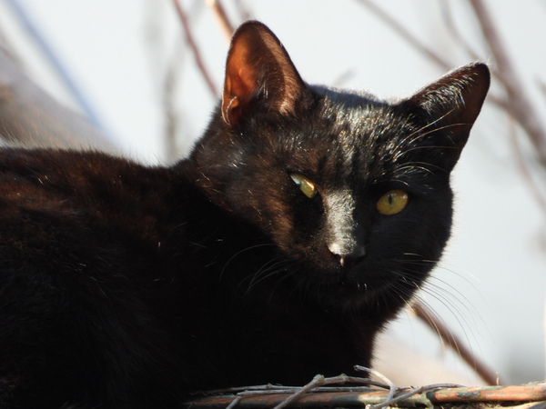 OM-3に標準ズームの「12-45mm F4」をつけ、望遠端で撮ったさっきの屋根上猫。近くまで寄って、枝の隙間から顔が見えるアングルを探していたらバレてしまった。2025年3月 OMデジタルソリューションズ OM SYSTEM OM-3