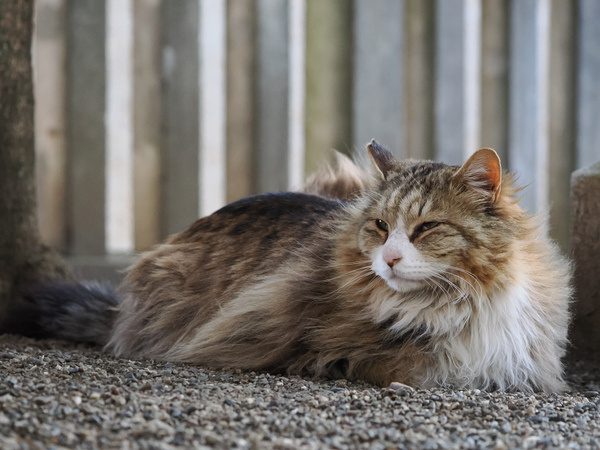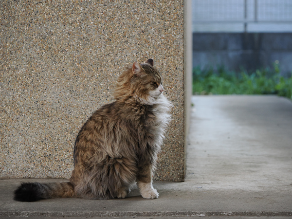 OM-3に「40-150mm F4」の望遠ズームをつけて、神社のキジトラ「きなこ」さん。後ろの草にほんのり日が差しているのがいい感じだったのだ。2025年3月 OMデジタルソリューションズ OM SYSTEM OM-3