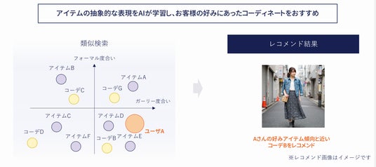 アイテムに対する顧客の行動データから、アイテムの抽象的な表現をAIが学習し、お客様の好みにあったコーディネートをおすすめします。
