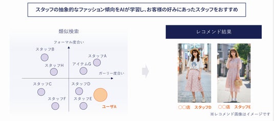 各スタッフコーデページ閲覧などの行動データから、スタッフの抽象的なファッション傾向をAIが学習し、お客様の好みにあったスタッフをおすすめします。