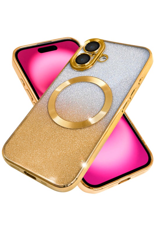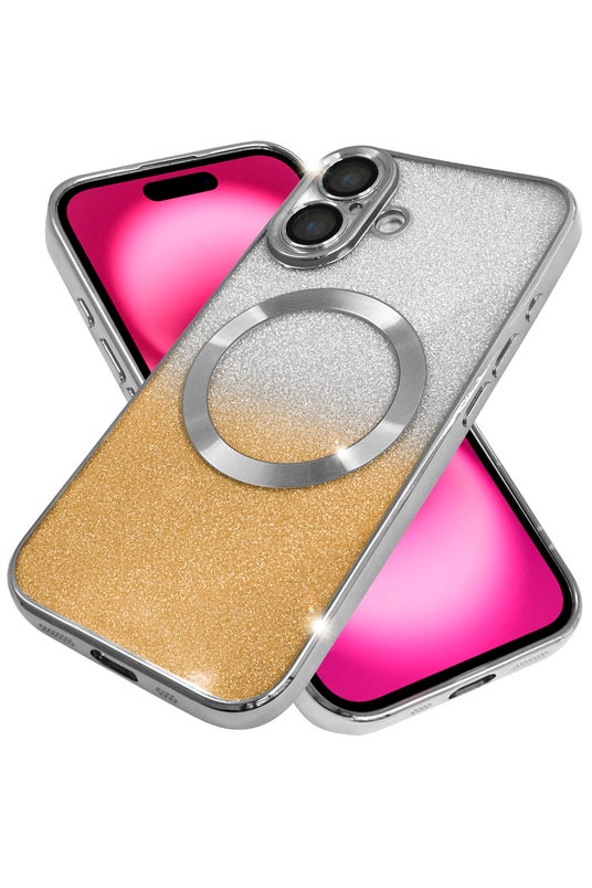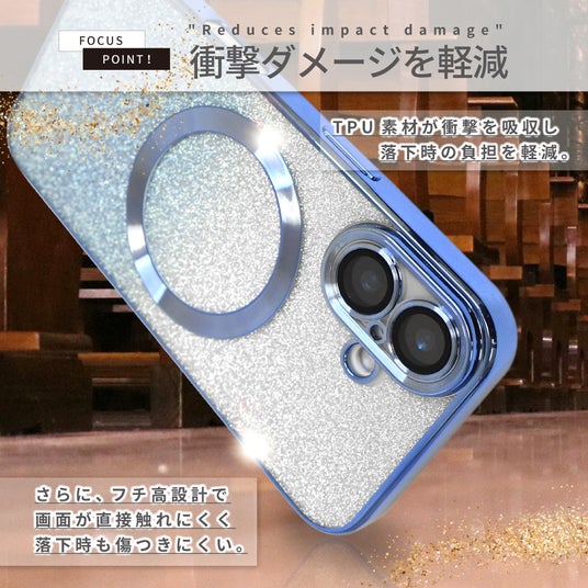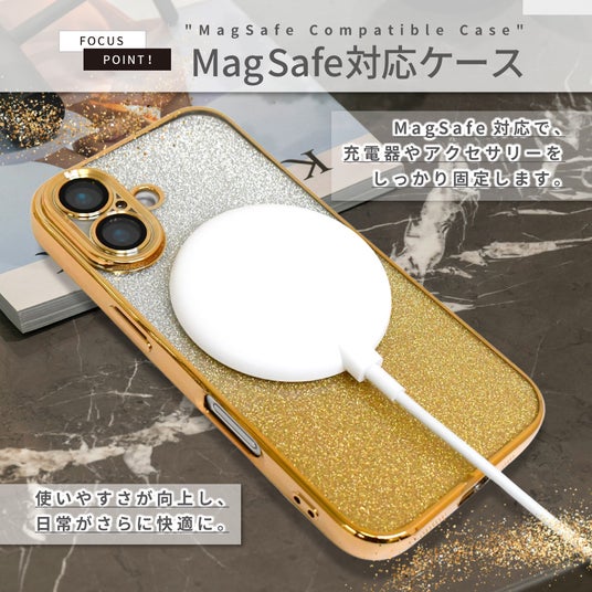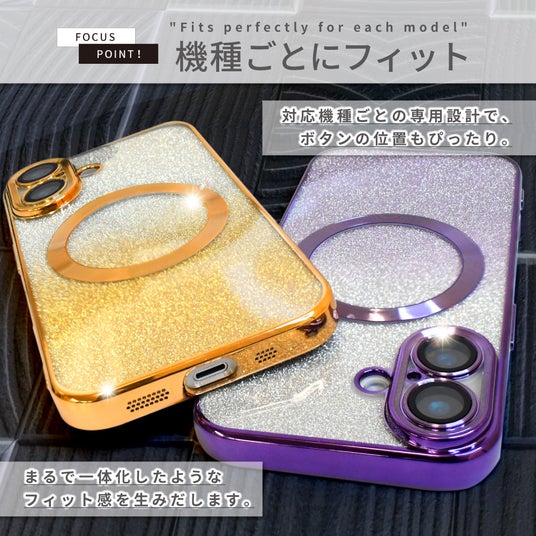 ラメが手元を彩るスマホケース。シートを入れて華やかに、外してシンプルに、2WAY仕様でスタイル自由自在。MagSafe対応で快適なワイヤレス充電を実現!
