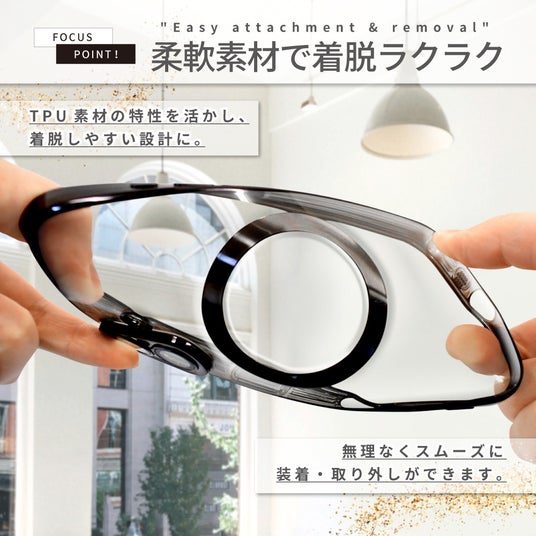 TPU素材の特性を活かし、しなやかで取り外しやすい設計を採用。