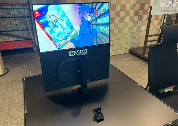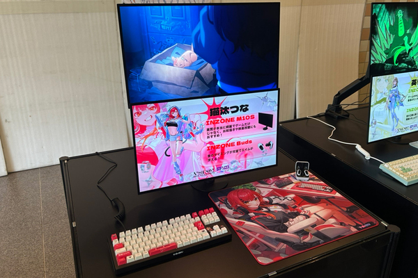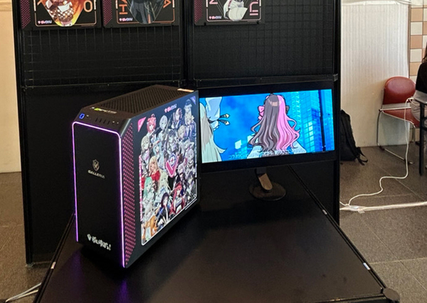 そのほか、入場入り口の通路には、イベント協賛メーカーの製品が展示されていました。その中で気になったのが、GALLERIAのぶいすぽっ!コラボのゲーミングPCです。このコラボゲーミングパソコンは、サイドパネルにぶいすぽっ!メンバーがあしらわれているのに加え、逆サイドやCPUクーラーなどにもオリジナルのコラボデザインが採用されているのが特徴です。なお、デザインの詳細は以下の記事でも紹介しているので、併せてチェックしてみてください。