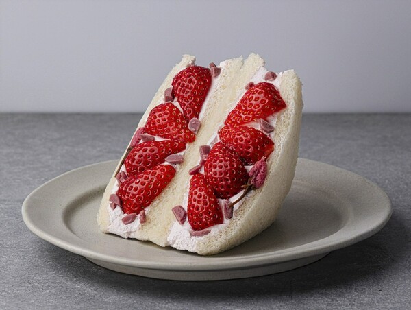 断面と内側に計4個のいちごを使った、華やかなサンドイッチ。クリームもいちご入りで、甘酸っぱく爽やかな味わいです。断面に飾られた桜の花の塩漬け、ルビーチョコが味のアクセントに。
