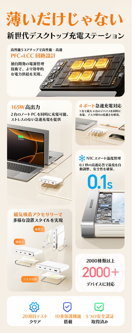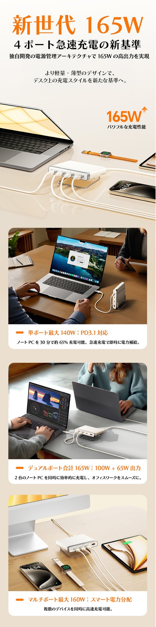 ・最大165Wの高出力で、ノートPCやスマホを同時に急速充電可能!