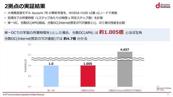 まず、2拠点の接続における実証実験では、秋葉原の単一データセンター内で、独自LLM「tsuzumi 7B」の事前学習を、NVIDIA H100を2基搭載したGPUサーバー2ノードで実施した場合の所有時間を1と設定。秋葉原と三鷹の2拠点をIOWN APNで結んだ場合は「約1.005倍」と、「ほぼ互角」の結果になったという。インターネットによって2拠点を接続すると、4.657倍かかると試算している。