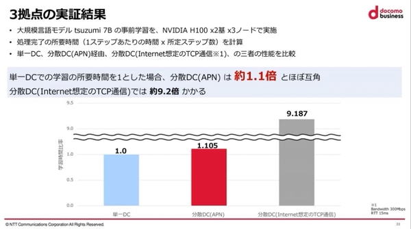 また、川崎の単一データセンター内で、H100を2基搭載したGPUサーバーを3ノードで実施した場合を1として、川崎、秋葉原、三鷹の3拠点をIOWN APNで接続した場合は「1.105倍」となり、同じく「ほぼ互角」と評価した。これをインターネット経由で実施すると、9.187倍かかると試算している。