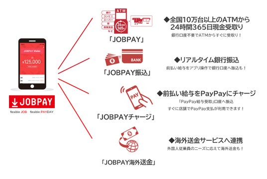 (註1)「JOBPAY」は銀行口座不要でATMから直接に前払い給与を受け取ることができる、ビジネス特許(特許第6007303)を取得した日本初の給与前払いサービスです。