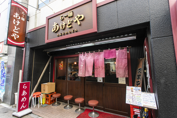 店主の夏目 亘さんは、学生時代に八千代市にある味噌ラーメンの名店「パンケ」でアルバイトを始める。徐々にラーメンの魅力にハマっていきラーメン店開業を目指すように。そして「パンケ」で店長を務め、船橋市の「拉麺 阿修羅」の2号店「拉麺 阿修羅 颯」の店長も任され実力を磨く。その後「拉麺 阿修羅 颯」の閉店と共に、その店舗を買い取り13年6月に「ら~麺 あけどや」をオープンさせて独力開業を果たした。今年で創業12年を迎えるが、さまざまな限定麺などもあり、地元民を中心に多くのラーメンフリークに愛されている。
