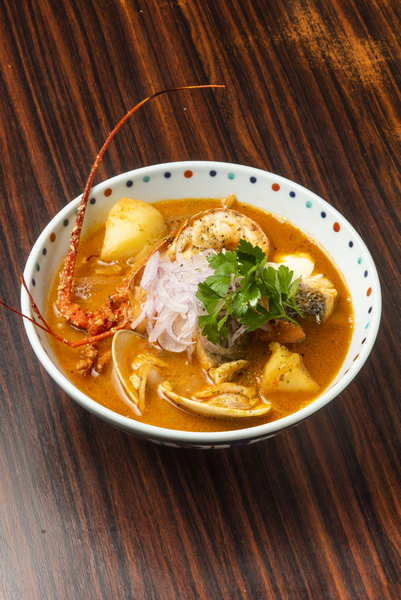 房総沖で捕れる伊勢エビやハマグリをサフランなどのスパイスと一緒に煮込み濃密なダシを取る。そのダシを「錦爽どり」の清湯スープと合わせて、そこに佐倉の味噌「ちばの恵」を入れた極上の魚介味噌スープ。ジャガイモやタマネギなどの野菜も入れて煮込んでいるので、奥深い味わいに。ひと口飲むと魚介の旨味と野菜の甘味が味噌と溶け込み極上の一杯に。今回だけしか食べられない、見た目も豪華なまさにスペシャルなラーメンになっている。